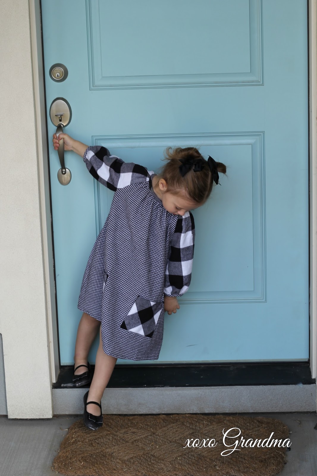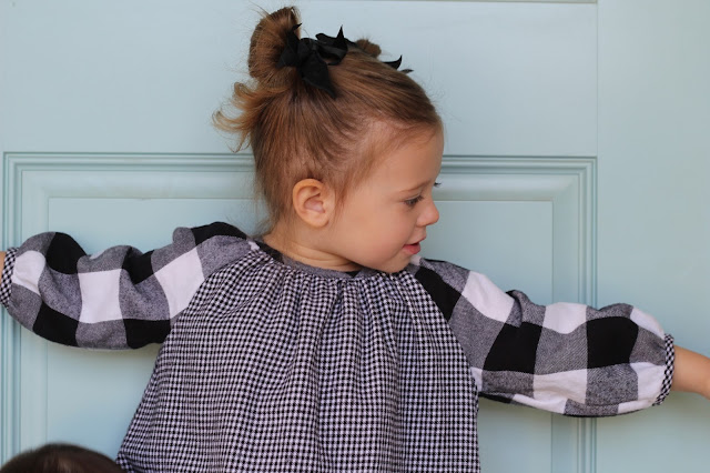 I had a hard time finding a shirting flannel that my daughter liked. I ended up choosing these black and white fabrics which complimented one another. They are a perfect match for a classic, casual winter dress.